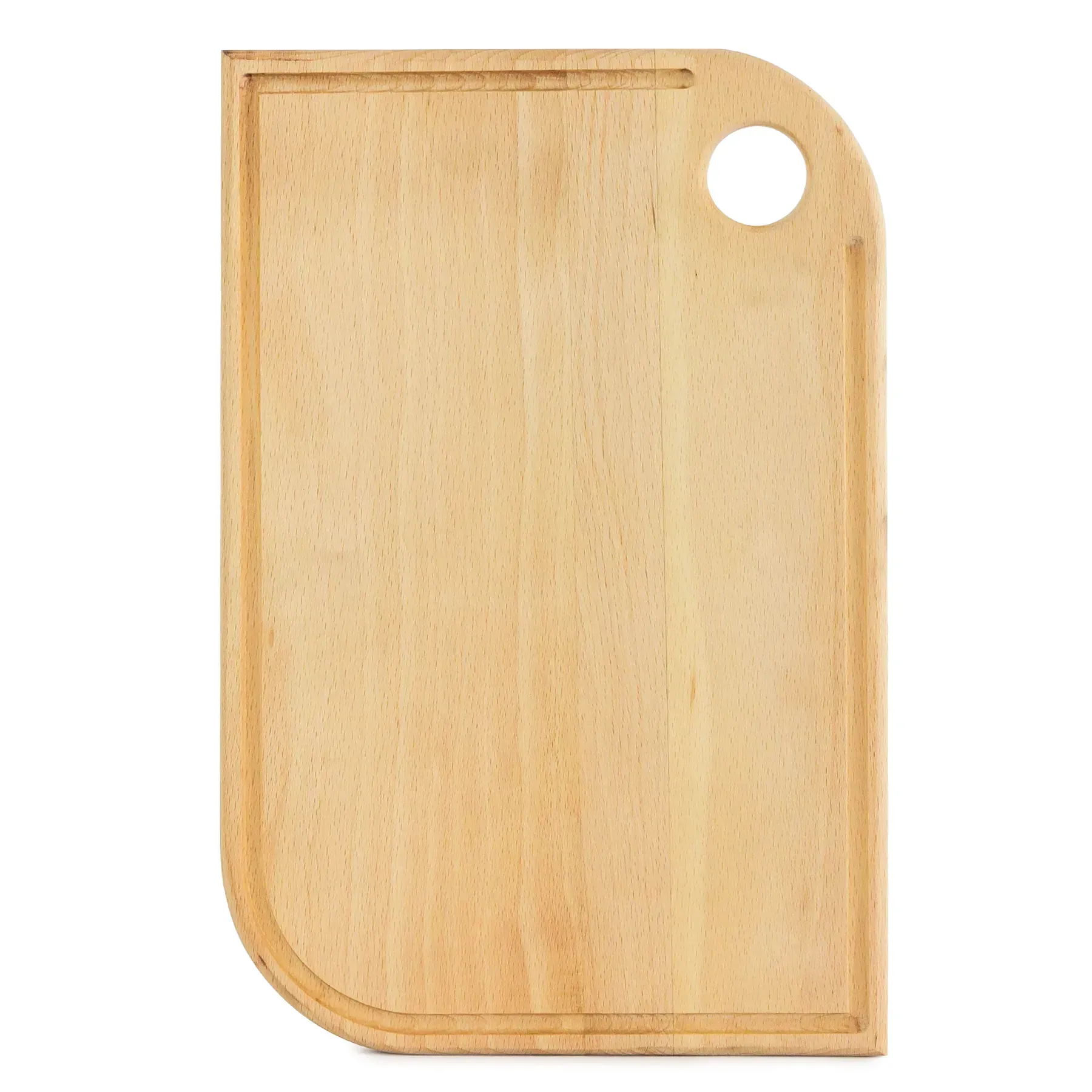 Дошка має натуральний відтінок деревини та природний малюнок зрізу бука, завдяки чому виглядає красиво й приємно зовні. У цій моделі немає жолоба, що дозволяє легко змітати нарізані продукти у підготовлену ємність.
