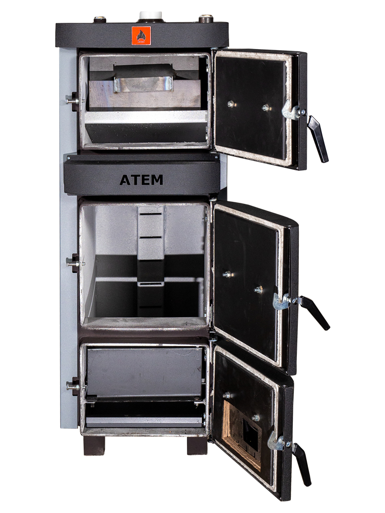 Конструкція котла включає три дверцята: верхні – для завантаження палива та очищення газоходу, нижні – для розпалювання та обслуговування колосників і зольної камери. На нижніх дверцятах розташована повітряна заслінка з регулювальним гвинтом. На верхній кришці встановлений термоіндикатор контролю температури.