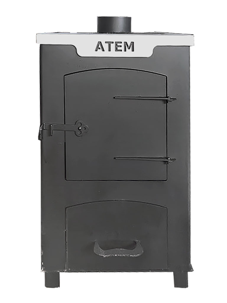 Сталева буржуйка АТЕМ потужністю 14 кВт – практичне рішення для обігріву невеликих приміщень та приготування їжі завдяки вбудованій варильній поверхні. Піч працює на дровах та трісці (не призначена для використання вугілля).
