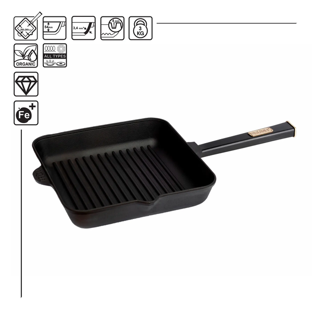 Сковорода Чавунна Квадратна Гриль BRIZOLL 28 см “Optima-Black” Професійна чавунна сковорода-гриль у стильному чорному виконанні. Ідеальна для приготування соковитих стейків, риби та овочів з характерними смужками гриля. Високі ребра збирають жир, роблячи страви здоровішими. Виготовлена з литого чавуну. Максимально висока температура та її стабільність. Ручка “Optima-Black” забезпечує зручне та надійне захоплення. Сковорода підходить для всіх типів плит (включаючи індукційні) та використання в духовці. Довговічний посуд, з природним антипригарним покриттям.