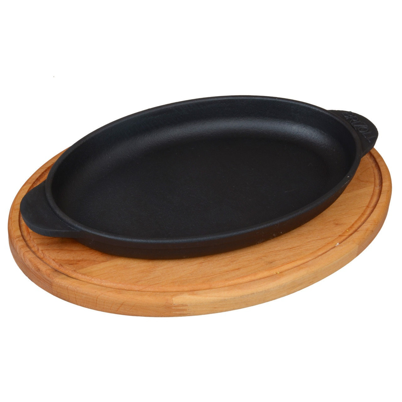 Сковорода Чавунна Порційна Овальна BRIZOLL 180×100 мм з підставкою (H1810-D) Овальна порційна сковорода для оригінальної подачі. Овальна форма ідеальна для сервірування ковбасок, риби або невеликих стейків. Виготовлена з литого чавуну, що утримує тепло. Комплект включає дерев’яну підставку для безпечної подачі на стіл.