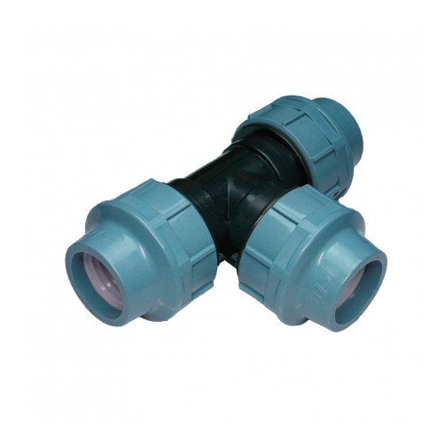 Трійник редукційний ПНД 25×32×25 мм – фітинг для розгалуження ПНД труби, де центральний відвід має більший діаметр (32 мм), ніж основна магістраль (25 мм).